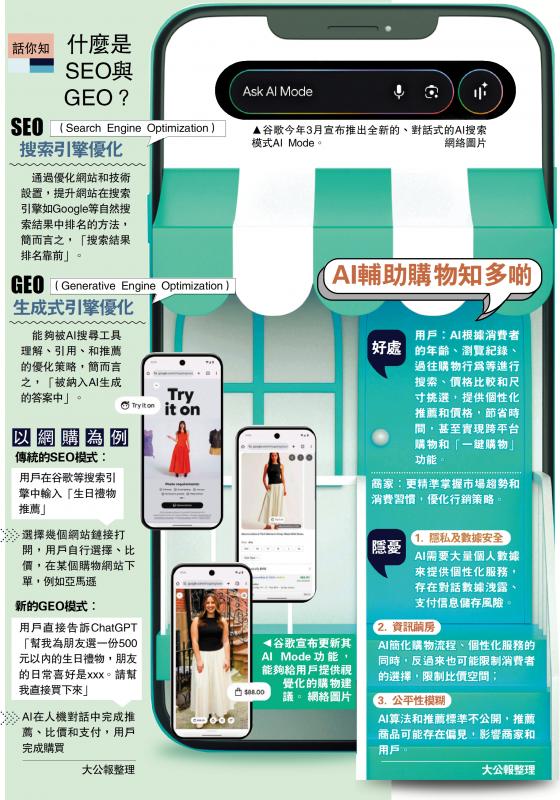 照片:Google在今年3月宣布,它推出了一种新的AI Talk模式,AI搜索模式。 \ Network Pictures SEO(搜索引擎优化)搜索引擎优化方法,通过优化网站和技术设置来改善搜索引擎(例如Google)上的网站排名。简而言之,“搜索结果很高。搜索结果(发动机生成的开发)生成引擎优化可以通过AI搜索工具来理解,提及和推荐反对方法。简而言之,这是AI生成的答案之一。 “以在线购物为例,以传统的SEO模型:用户输入“生日推荐”生日“搜索引擎”,例如Google。新的Geo模型:用户直接告诉Chatgpt“帮助我为我的朋友不到500元的朋友选择生日礼物。我的朋友节 - 一天的祝福是xxx。请帮助我直接购买。” AI完成了建议,价格比较和P人力计算机对话和完成用户的购买。 DA如果PAO对AI帮助购物对用户有更多的好处:AI搜索,价格和基于尺寸的尺寸,浏览记录,过去的购物行为等,提供个人建议和价格,节省时间,甚至可以实现跨平台购物和“一键式购物”功能。商人:更准确地了解HealAket趋势和消费习惯,并优化营销技术。隐藏问题1。隐私和数据安全需要大量的个人数据来提供个性化服务,这构成了存储通信数据和付款信息存储的风险。 2。信息茧AI简化了购物过程和个性化服务,但反过来也可以限制消费者的选择并限制价格比较空间; 3。模糊公平。 AI算法和建议标准未披露,推荐产品可能会有偏见,这会影响商人D用户。如果pao的汇编